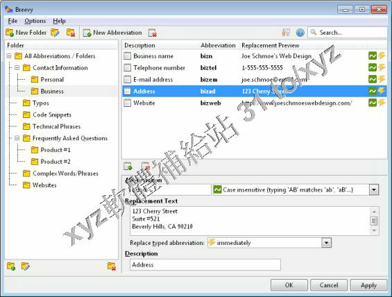 的詞組,只要鍵入任何短語的縮寫,Breevy將自動快速準確用與它的相應的詞組取代它。